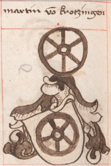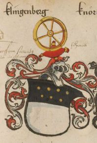 Zieht man nun die Heraldik mit in die Analyse ein, dann wird ein Muster erkennbar was mich vermuten lässt, dass die Klingenberger sowohl auf Burg Klingenberg als auch auf der Kollenburg der Schenken von Schüpf saßen. Das Wappen derer von Schüpf zeigt fünf Streitkolben (oder wohl eher Schippen = Schaufel) auf blauem Grund. Das Wappen der Herren von Klingenberg am Main zeigt einen mittig in schwarz und weiß geteilten Schild; als Helmzier ein sechsspeichiges Rad. Aus den Zeugenreihen zahlreicher Urkunden lässt sich erkennen, dass es die Klingenberger und die Kolmans einem gemeinsamen Stamm entspringen. Sie zeigten die Zugehörigkeit entweder durch einen mittig geteilten Schild oder einem sechsspeichgen Rad im Wappen. Später kam noch ein halber schreitender Löwe, beziehungsweise ein gerandetes Schild hinzu. Die Teilung, dass ein Sohn ein mittig geteiltes, der andere ein Rad im Wappen trug wurde auch in den Folgegenerationen beibehalten. Nehmen wir zum Beispiel die Herren von Endingen. Der Schultheiß Dietrich von Endingen hatte einen mittig in blau und weiß geteilten Schild. Die Linie seines Bruders der Coler (später auch Colman) scheint jedoch einen gerandeten Schild mit Rad in der Mitte geführt zu haben. Selbes scheint sich bei der verwandten Linie der Tusslinger zu zeigen. Dort scheinen die bei Dußlingen verbliebene Linie einen mittig in rot und weiß geteilten Schild geführt zu haben, die Tusslinger im Breisgau ebenfalls einen gold gerandeten Schild mit Rad in der Mitte. Den mittig geteilten Schild mit steigendem Löwen begegnen wir auch bei den Hofstettern und bei denen aus ihnen hervorgehenden Schenken von Geyern, welche J.P.J. Gewin als Abkömlinge des Küchenmeisters Heinrich von Rothenburg hält. Bei der Linie der Geben-Schüser finde ich ein ähnliches Muster. Diese Linie trug den gerandeten Schild (wie die Kolmans und Tusslinger) der Schild war jedoch in einer Line mit einem Schrägbalken geteilt (wie bei den Meyer-Niesen, worin ich im Ursprung Meyer derer von Neuffen vermute), eine andere Linie trug den gerandeten Schild mit halben schreitenden Löwen. Bei dieser Logik bleibend macht nun das in der Schlachtkapelle bei Sempach gezeigte Wappen des 1386 gefallenen Hans Schaller Sinn. Es zeigt das mittig geteilte Wappen mit steigendem Löwen der Endinger Linie, lediglich mit zusätzlich drei schwarzen Ringen im unteren Teil. Sein Bruder Lüthold, trug jedoch wohl den gerandeten Schild mit Schrägbalken. Somit darf man wohl davon ausgehen, dass das gezeigte Wappen in der Schlachtkapelle fälschlich den Namen Hans Schaller nennt. Richtigerweise sollte es Hans Scheffer heißen. Sein Sohn bezeichnete sich 1392 als Hans Scheffer, der Witwen Sohn von Weitbruch als er der Deutschordenskommende in Beuggen Urfehde schwor. Die drei zusätzlichen Ringe könnten auf die Schönauer hindeuten. Hürus von Schönau der ebenfalls bei der Schlacht bei Sempach fiel war mit Anna von Klingenberg verheiratet. Das wir dann später die Geben-Schüser (Scheffer) als Vögte von Birkingen in der Schönauer Herrschaft Hauenstein antreffen wäre nicht weiter verwunderlich. Für das älteste Wappen halte ich das mittig geteilte Schild mit Steigendem Löwen der Endinger Linie. Nach meinen Recherchen beruht es auf dem Wappen der Herren von Reinstein-Homburg (am Main). Aus ihnen gingen die Küchenmeister von Rothenburg die durch Heirat mit den Herren von Weinsberg verwandt waren, die Herren von Neuenburg (Neuenburg-Triefenstein), hervor. Die Herren von Reinstein-Homburg gingen wiederum aus den Herren von Zabelstein hervor. Sie waren vermutlich zunächst Ministeriale der Grafen von Comburg und nach deren Übertritt in den Klerus dann Ministeriale des Bistums Würzburg. Ein verwandtschaftliches Verhältnis bestand auch zu den Schenken von Schüpf. Ich vermute gar, dass die Zabelsteiner und die Schenken von Schüpf identisch sind und durch Heirat einer Tochter mit Conrad Pris verwandt waren. Conrad genoss hohes Ansehen bei den Staufern. Ebenso die Edelfreien von Grumbach. Die Zabelsteiner / Homburger finden wir im engen Umfeld beider Familien. Vermutet J.P.J. Gewin, dass die Familie erst Anfang des 13. Jahrhunderts in die Gegend um Rothenburg o.d.T. kam, zeigen meine Forschungen, dass dies vermutlich bereits um 1103 mit Iring II., Sohn oder wohl eher Enkel des Iring von Freinberg (einmal gemeinsam als Zeuge mit Bernhard von Weilheim und einmal mit Özi von Klenau - beide ebenfalls Linien der Familie nach J.P.J. Gewin) geschah, den wir dort gemeinsam mit Graf Heinrich von Comburg als Zeugen in einer Urkunde antreffen. In einer Urkunde um 1075 des Friedrich von Walde Sachsenkam und dessen Bruder Heinrich, tritt Iring gemeinsam mit Penno (Bernhard von Weilheim) als Zeuge auf. Um die Linien genauer trennen zu können bedarf es mehr als nur die Zuordnung über Vornamen. Drum ziehen wir nun die Wappenkunde mit in die Untersuchung mit ein.