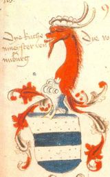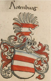 Als Stammvater der Linie von Nordenberg (Nortenberg, Nortinberc, Northinberg, Nordberg, Nortemberg) kann Heinrichs I. Sohn Lupold angenommen werden, der im Frühjahr 1221 gemeinsam mit seinem Cousin Hartwig von Rothenburg vermutlich am Vierten Kreuzzug (Kreuzzug von Damiette) teilnehmen wollte.[53] Zumindest erscheinen beide, Hartwig und Lupold, als Zeugen in einer Urkunde, die in Bari (Italien) ausgestellt wurde. Ihren Sitz hatte die Linie auf Burg Nordenberg. Sein gleichnamiger Sohn oder Neffe Lupold benannte sich nicht nach Nordenberg, sondern nach Weiltingen.[54] Dieser war mit Margarethe Hackin (von Wellstein), der zweiten Gemahlin des nach 1282 verstorbenen Schenken Gerung von Ehringen der auf Burg Schenkenstein seinen Sitz hatte, verheiratet.[55] Der erste König aus dem Hause Habsburg, Rudolf, verpfändete "seinem Küchenmeister" (coquine nostre magistro) am 22. September 1277 zu Wien die Zehnten zu Wittelshofen und Gerlefingen für 50 Mark Silber.[56] Am 21. August 1281 leihte sich König Rudolf von Habsburg erneut Geld bei Lupold von Nordenberg. Für die 400 Mark Silber übertrug er Lupold 200 Pfund jährliche Einkünfte von Dinkelsbühl.[57] Nach Colland nannten sich die Herren von Nordenberg auch Küchenmeister von Billried (1287 kauften Lupold und sein Sohn Heinrich die Burg von seinen Verwandten, den Schenken von Limpurg) und von Veinau. Auch er beschreibt die Teilung dieser Nebenlinie in weitere Nebenlinien, die sich jeweils nach den Burgen, die sie besaßen, benannten, darunter von Bebenburg, Truchsesse von Habelsee oder Habelsheim, von Seldeneck, von Veinau, von Stollberg (vermutlich über Ansprüche der Grafen von Wertheim die mit den Schenken von Schüpf verwandt waren) und die Herren von Hohenlohe-Brauneck.[58] Nach dem Tod König Rudolfs von Habsburg versuchte Adolf von Nassau die Gunst des habsburgerfreundlichen Haus Nordenberg zu erlangen in dem er das Würzburger Domkapitel dazu bat den Sohn des Küchenmeisters von Nordenberg zum canonicus zu wählen.[59] Um 1300 war Friedrich von Seldeneck mit Elisabeth von Ellrichshausen, einer Tochter des Ludwig von Ellrichshausen, verheiratet. Aus der Ehe gingen die Söhne Ludwig und Heinrich von Seldeneck hervor. Die Herren von Ellrichshausen waren ein reichsfreiherrliches Geschlecht. Beim Konflikt zwischen Ludwig von Bayern und seinem Gegenkönig Friedrich dem Schönen hielten Nordenberger zum Haus Österreich. Nach der Schlacht bei Mühldorf 1322 verloren Heinrich und Leopold von Nordenberg Burg Billriet welche Ludwig von Bayern nun Ludwig und Berthold von Henneberg zu Lehen gab.[60] Sie muss danach aber wieder in deren Besitz gelangt sein. Kindler von Knobloch weist weitere Heiratsverbindungen der Nordenberger zu den Herren von Westerstetten und den Herren von Friedingen nach.[61] 1369 siegelt Lupold von Nordenberg für seine Ehefrau Anna von Westerstetten, Tochter des Heinrich von Westerstetten und der Ida von Hertenstein, die in erster Ehe mit Heinrich von Bernheim verheiratet war.[47] Angeblich gehen auch die Küchenmeister von Wächtersbach, von Gamburg, von Schwartzenfels, das Schweizer Geschlecht Küchenmeister sowie die Meißner Familie Küchenmeister auf die Rothenburger zurück.[62] [63] Nach dem Aussterben der Nordenberger Linie, in der das erbliche Amt der königlichen Küchenmeisters verblieben war, ging es an die Herren von Seldeneck über.